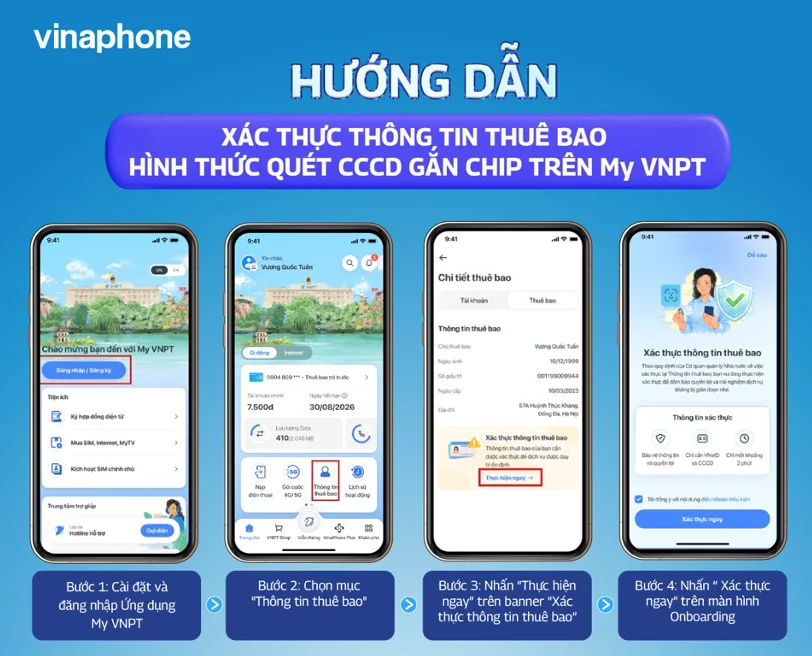 Thực hiện: Đến cửa hàng VNPT VinaPhone gần nhất. Đội ngũ giao dịch viên sẽ hỗ trợ xác thực miễn phí 100%.