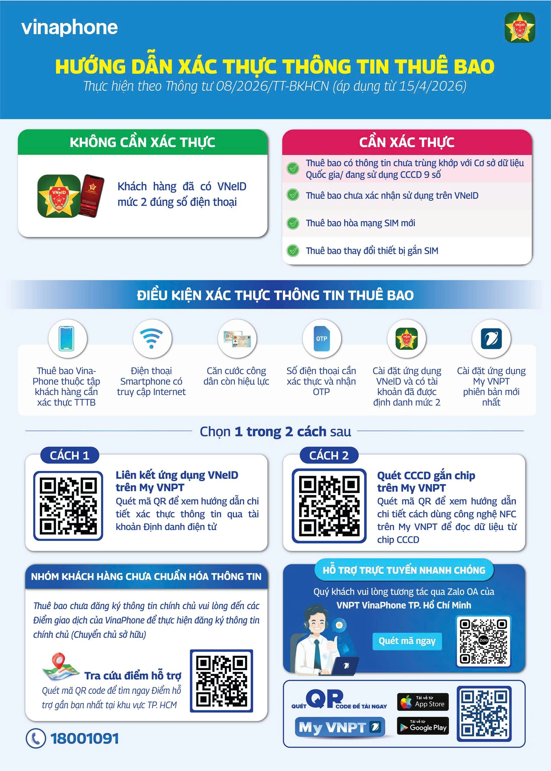 Thực hiện quy định mới theo Thông tư số 08/2026/TT-BKHCN của Bộ Khoa học và Công nghệ, bắt đầu từ ngày 15/04/2026, việc xác thực thông tin thuê bao di động là thủ tục bắt buộc đối với mọi khách hàng.